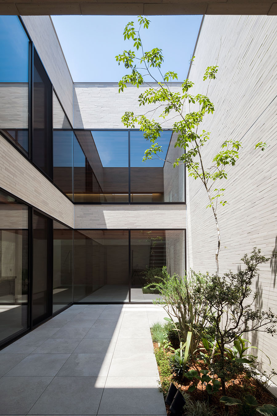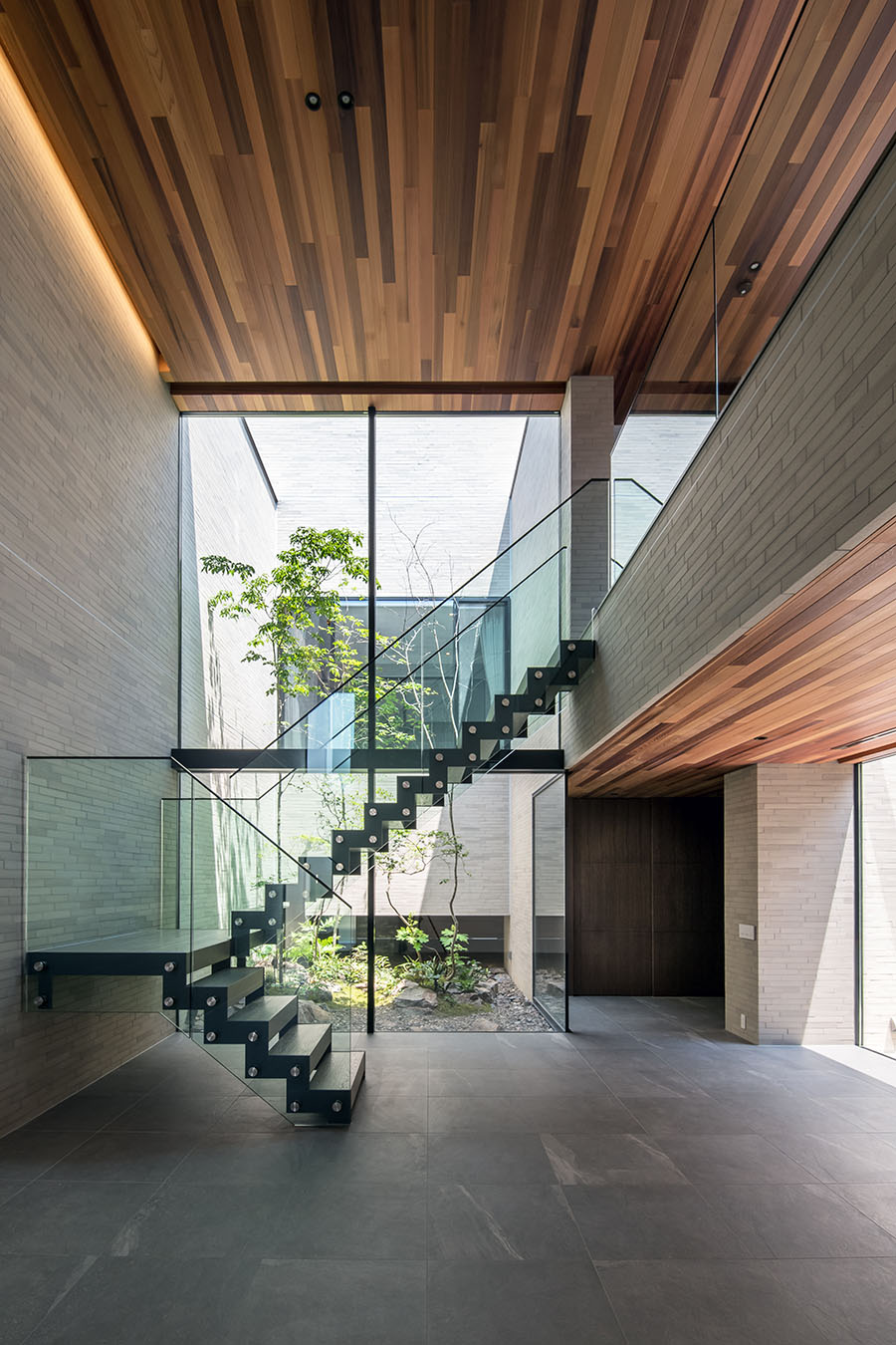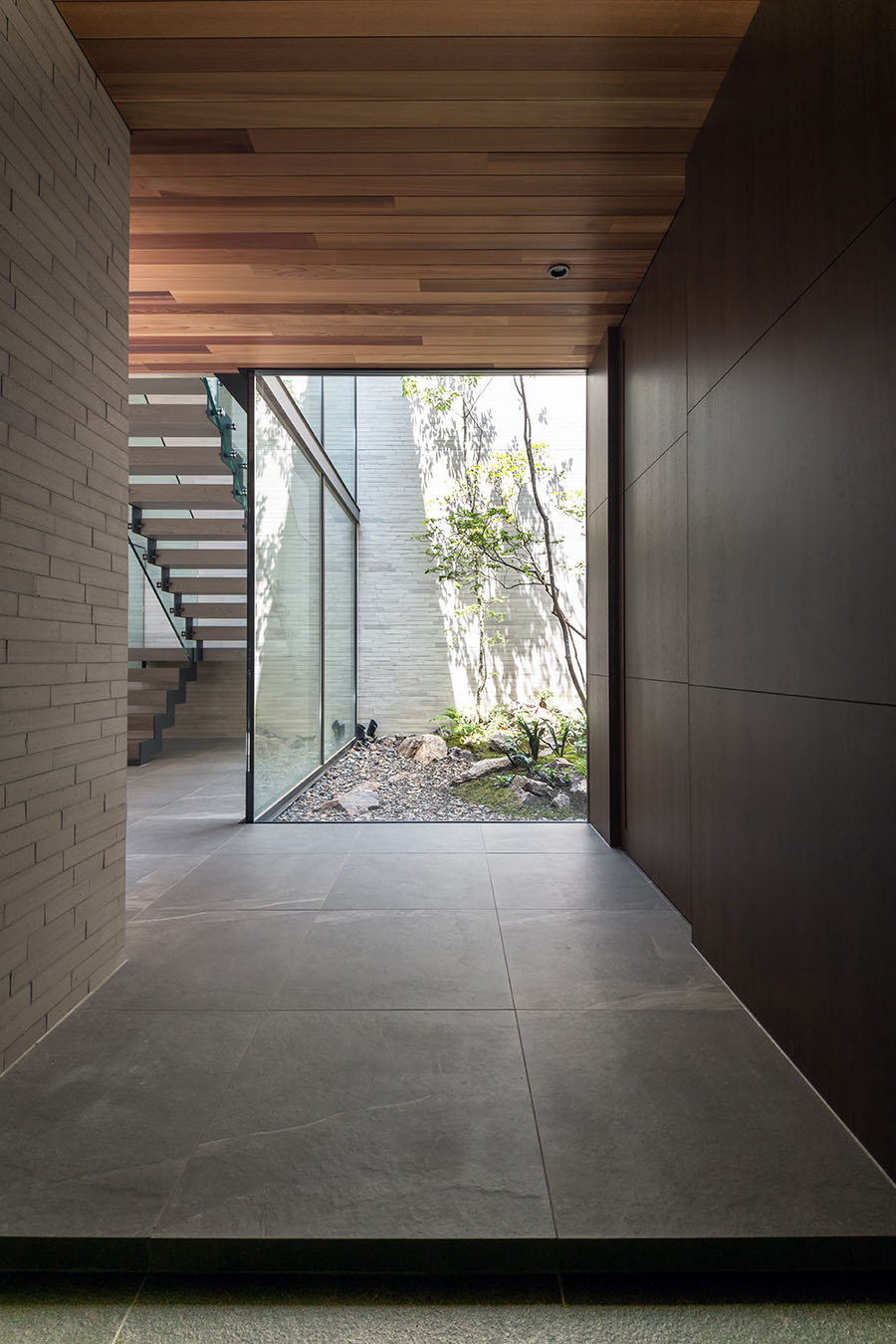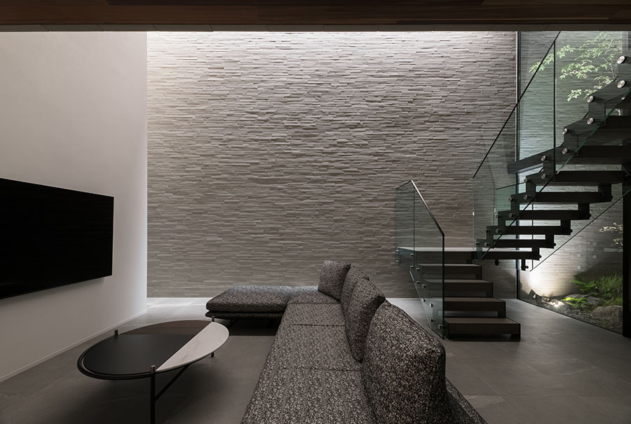 戸建てやマンションが立ち並ぶ街区に建つ、都会的な佇まいの邸宅。「アーキテクトシックス建築事務所」の一級建築士である六鹿(むつが)さんが手掛けたこのお宅は、中庭のあるコートハウススタイルを採用し、外部への開口部を少なくすることでプライバシーやセキュリティに配慮して設計されている。というのも、当初からお施主様は住宅が立ち並ぶ周辺環境が気にならない住まいづくりをご希望されていた。そこで、六鹿さんは建築地の広さを生かしたコートハウスを提案することにしたという。