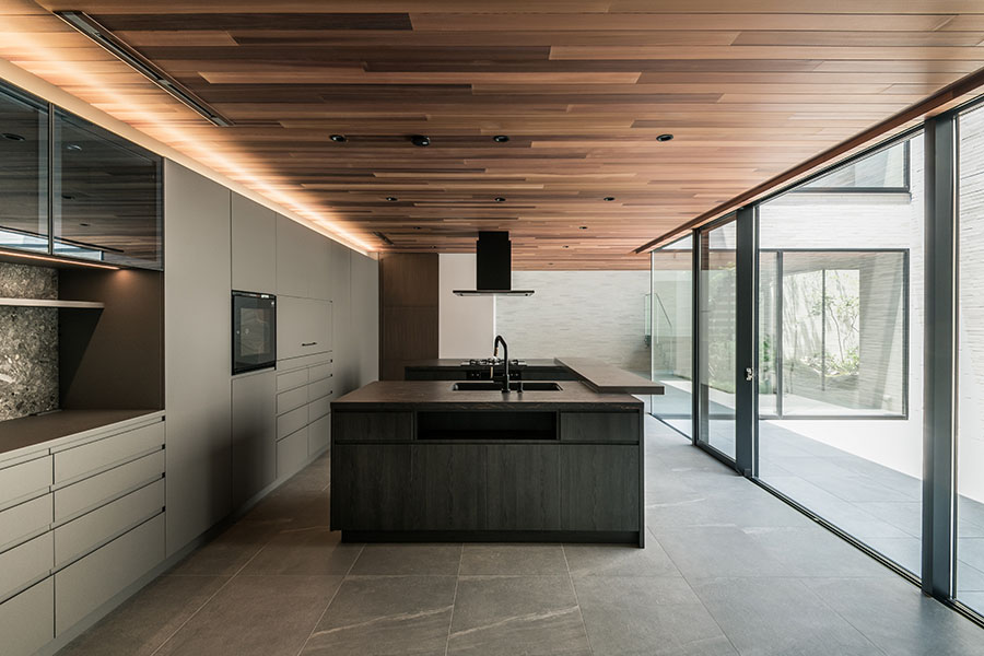 入口から敷地内に一歩入ると、その内側には周囲を囲む背の高い壁や開口部のない外観からは想像もつかないほど、開放的で明るい空間が広がっている。各所に中庭を設けた建物内は、ガラス張りの大きな窓を通して家全体に明るさを取り込むと同時に、ガラス越しにつながるお庭が空間に連続性を感じさせる開放感を演出。特に、玄関エントランスの先に広がっているリビングには、二層吹き抜けの天井まで高さ6メートルものガラス張りの大開口部を設けており、ガラス手摺のスケルトン階段とその向こうに見える雑木で魅せるダイナミックな空間をデザインしている。そして、リビングのその先にはダイニングキッチン。開放感と連続性を持ってつながる空間を生かし、家事をしながらでも家族の様子を気にかけられるようにと、キッチンはリビングとダイニングの間、家族の居場所の中心とした。